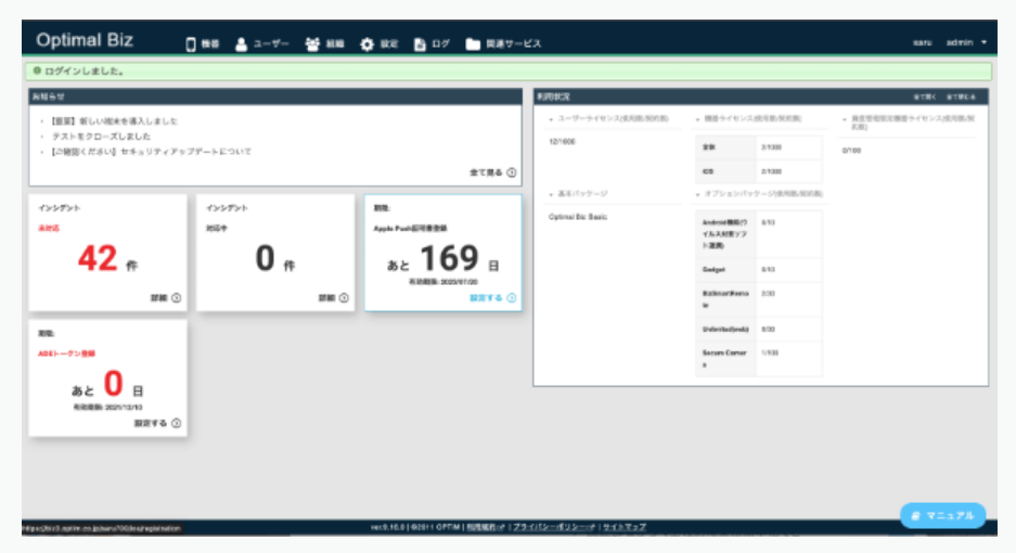 Optimal Bizは、企業が使用するスマートフォンやタブレットなどのモバイル端末を一括管理するMDM(モバイルデバイス管理)サービスです。遠隔操作でのロックやデータ消去機能、アプリ配信やセキュリティ強化機能を搭載し、大量端末の管理コストを大幅に削減します。プライベートクラウドやオンプレミス環境にも対応し、官公庁や教育機関、企業のセキュリティレベル向上を支援。国内18万社以上で導入されており、業界での圧倒的なシェアを誇ります。
