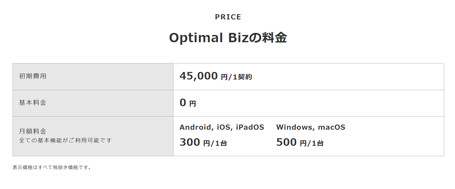 初期費用:45,000円/1契約、月額料金:Android・iOS 300円/台、Windows・macOS 500円/台(税抜)。