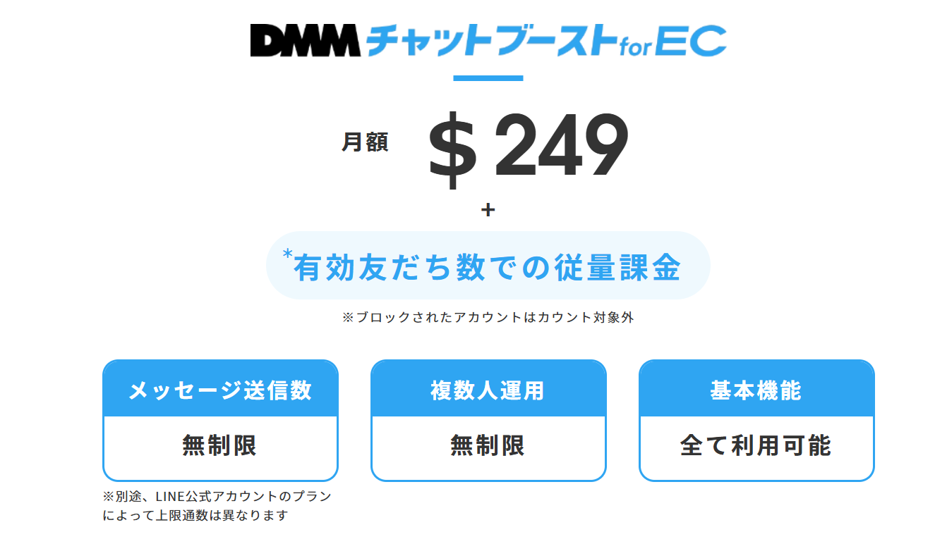 月額249ドル+有効友だち数に基づく従量課金制。無料トライアルあり。