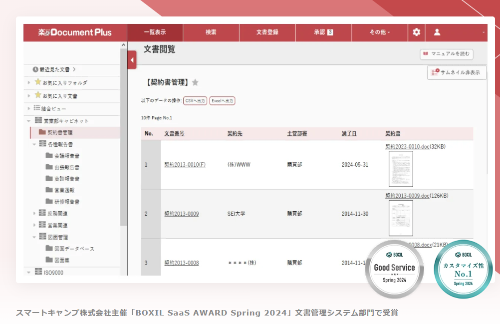 楽々Document Plusは、ペーパーレス化を促進し、ドキュメントDXを強力にサポートする文書管理システムです。契約書管理やISO文書管理など、多種多様なドキュメントや業務に対応可能で、紙文書やフォーマットの異なるドキュメントも一元管理できます。また、当社のエンタープライズサーチ製品を標準搭載し、高速・高精度な検索機能で必要な情報を迅速に取得できます。さらに、クラウド・オンプレミスの導入形態から選択でき、組織の規模や環境、運用方法に合わせた最適な導入が可能です。