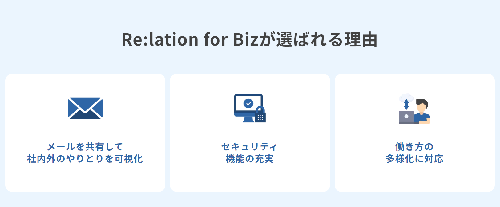 Re:lation for Bizは新しいメール共有・管理クラウドサービスで、社内外のメールを集約し、堅牢なセキュリティで安心して使用できます。メールを共有して社内外とのやりとりを可視化するだけでなく、情報漏洩を防ぐ多数のセキュリティ機能が搭載されています。
