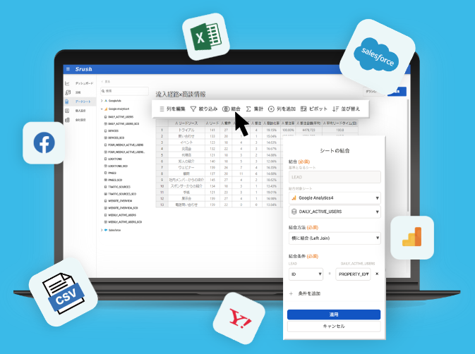 Srushは、100種類以上の連携先とクリックだけでデータを統合し、すぐに分析を始められるデータ統一プラットフォームです。