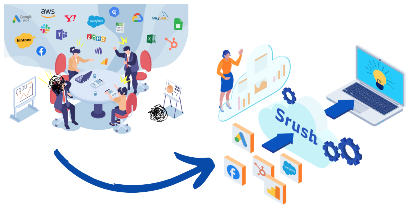 Srushは、広告、受注、売上、顧客情報など、システムごとにバラバラに散らばったデータをワンクリックで統合するデータ統一クラウドです。これにより、これまでデータの分断によって実現できなかった戦略的なデータ分析が可能になります。