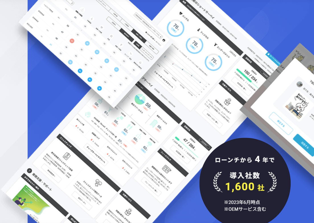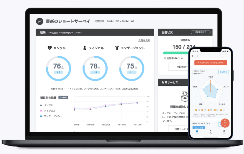 組織の強みと課題が必ず見つかる。1億の蓄積されたデータから導かれるエンゲージメントやメンタル・フィジカルデータはもちろん、eNPSや企業リスク、など組織の状態を可視化する上で必要な設問を網羅しています。