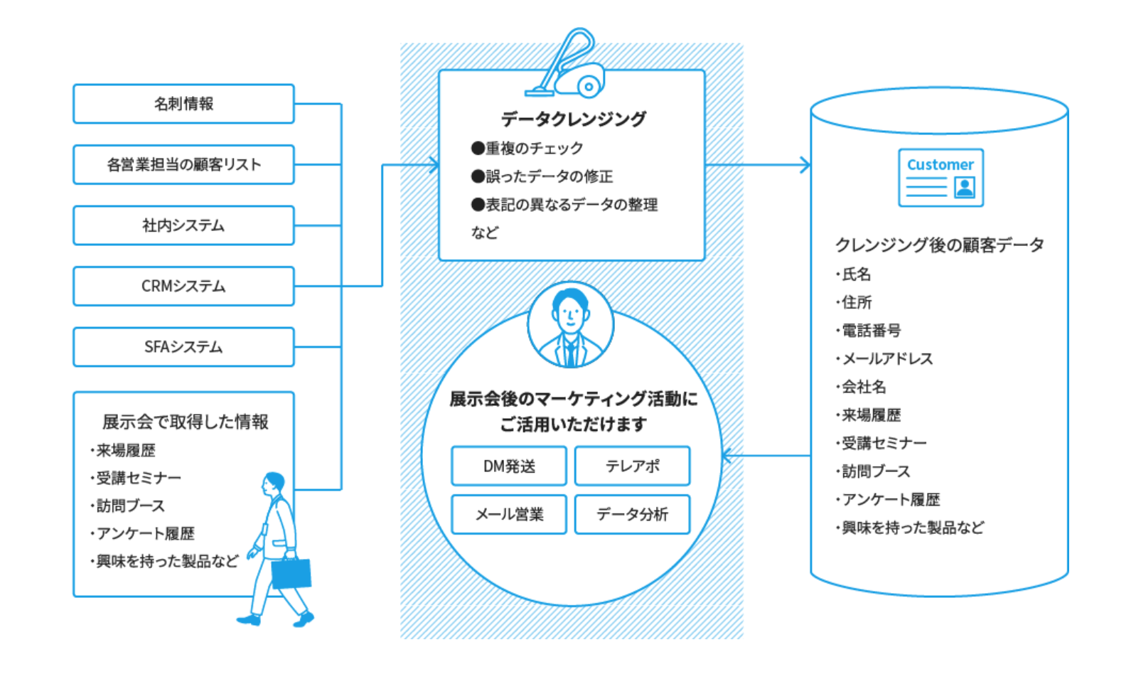 QRコードやバーコードによるスムーズな受付が可能です。スピーディな入場や迅速な営業フォローを実現できます。画面表示のカスタマイズや、会場内で行われる個別セミナーの受付にも対応可能です。