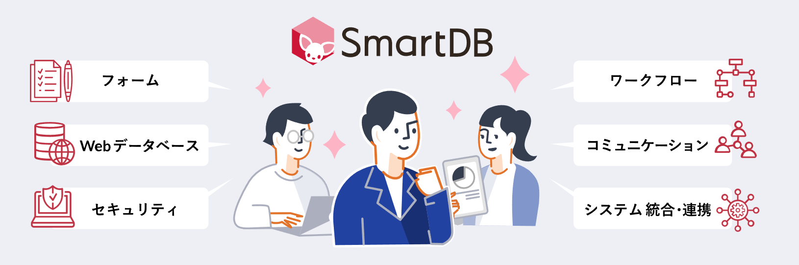 SmartDBは、堅牢なセキュリティを提供し、適切で迅速な情報連携でコラボレーションを活性化します。外部システムやSaaSとの連携も容易で、業務のシームレスな連携が可能です。