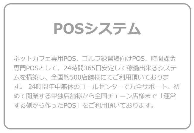 ネットカフェ専用POS、ゴルフ練習場向けPOS、時間課金専門POSとして、24時間365日安定して稼働できるシステムを構築し、全国約500店舗で利用されています。24時間年中無休のコールセンターで万全サポートを提供しています。