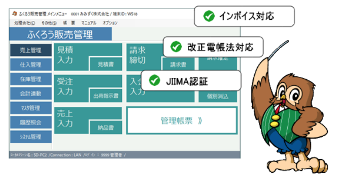 ふくろう販売管理システムは、最新の開発言語を採用し、Windows 10や11などの最新64bit OSにも対応しています。また、IT内部統制やセキュリティ機能も充実しており、請求確定や仕訳転記処理による更新ロック、在庫割れ・原価割れ・与信チェックの警告、入力可能伝票日付設定、伝票の登録・修正・削除の履歴確認、主要マスタの追加・修正・削除の履歴確認、ログイン担当者別の操作権限設定、操作ログの自動保存・確認など、安心してご利用いただける機能を備えています。