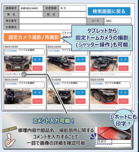 本システムは、保安基準の確認だけでなく、入出庫時のサークルチェック、交換部品の記録、鈑金補修、中古車の画像管理など、さまざまな用途で活用できます。これにより、お客様への提示資料として信頼獲得のツールとなり、エビデンスの強化に貢献します
