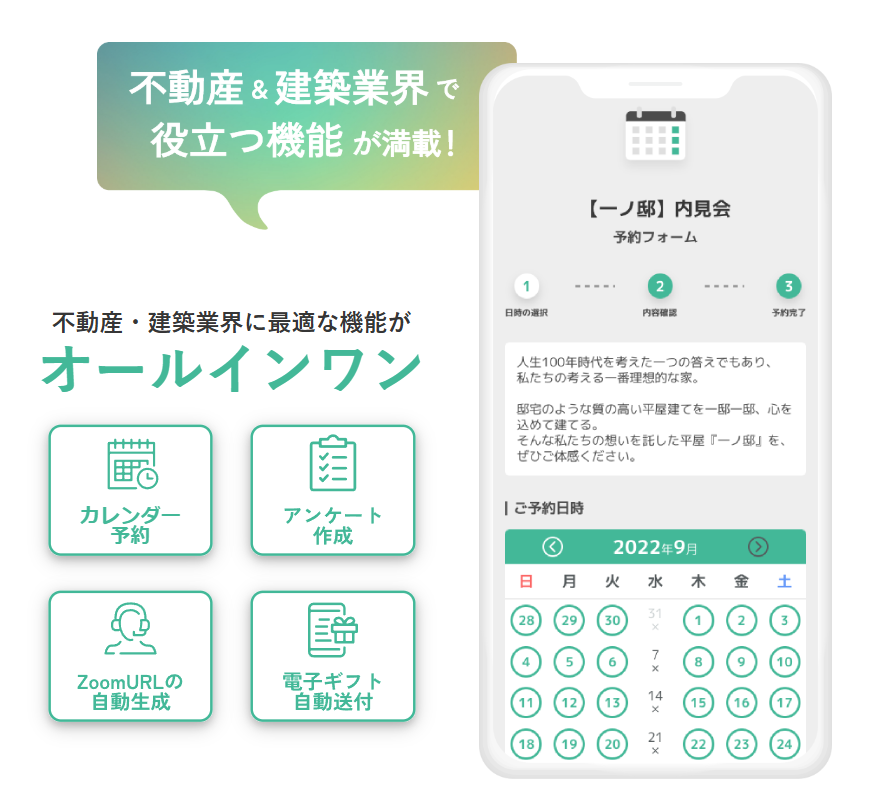 apottaは、アポイント取得の効率や商談の品質を向上させる、不動産・建築業界に特化した予約システムです。24時間いつでも即時予約確定が可能で、リモート商談の予約もスムーズに行えます。