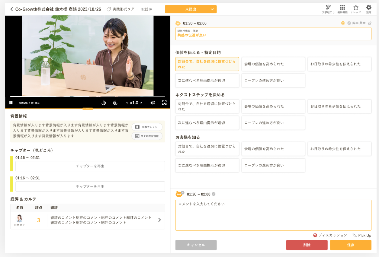 商談やプレゼンの実践状況を動画で可視化し、成約率だけでなくそのプロセスを分析・評価。組織内で統一した評価基準を作り、育成効果を最大化するシステム&コンサルティング。