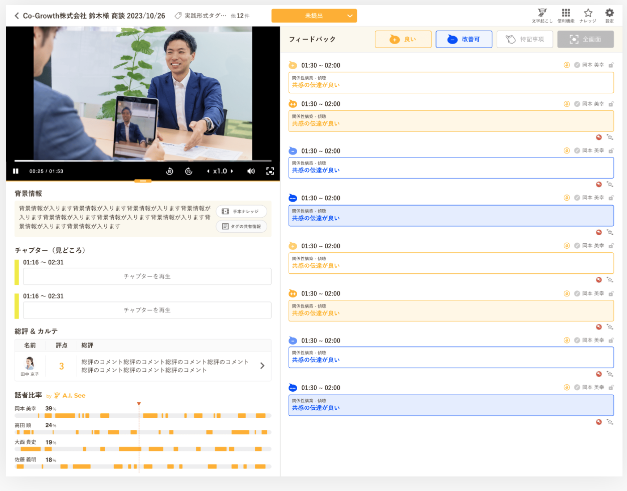 動画を活用した「超可視化」システムにより、営業や商談の実践を分析・評価。フィードバックも動画で行うことで、育成の精度とスピードを向上。