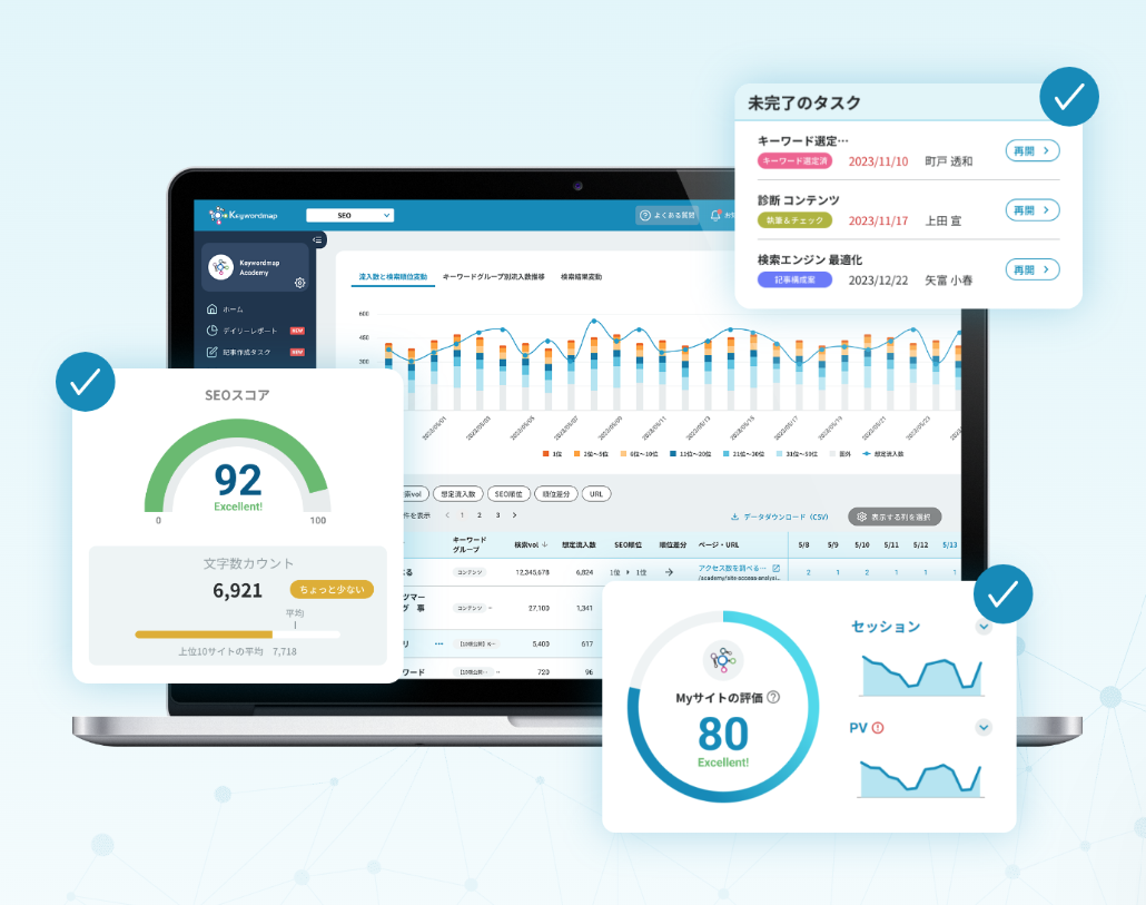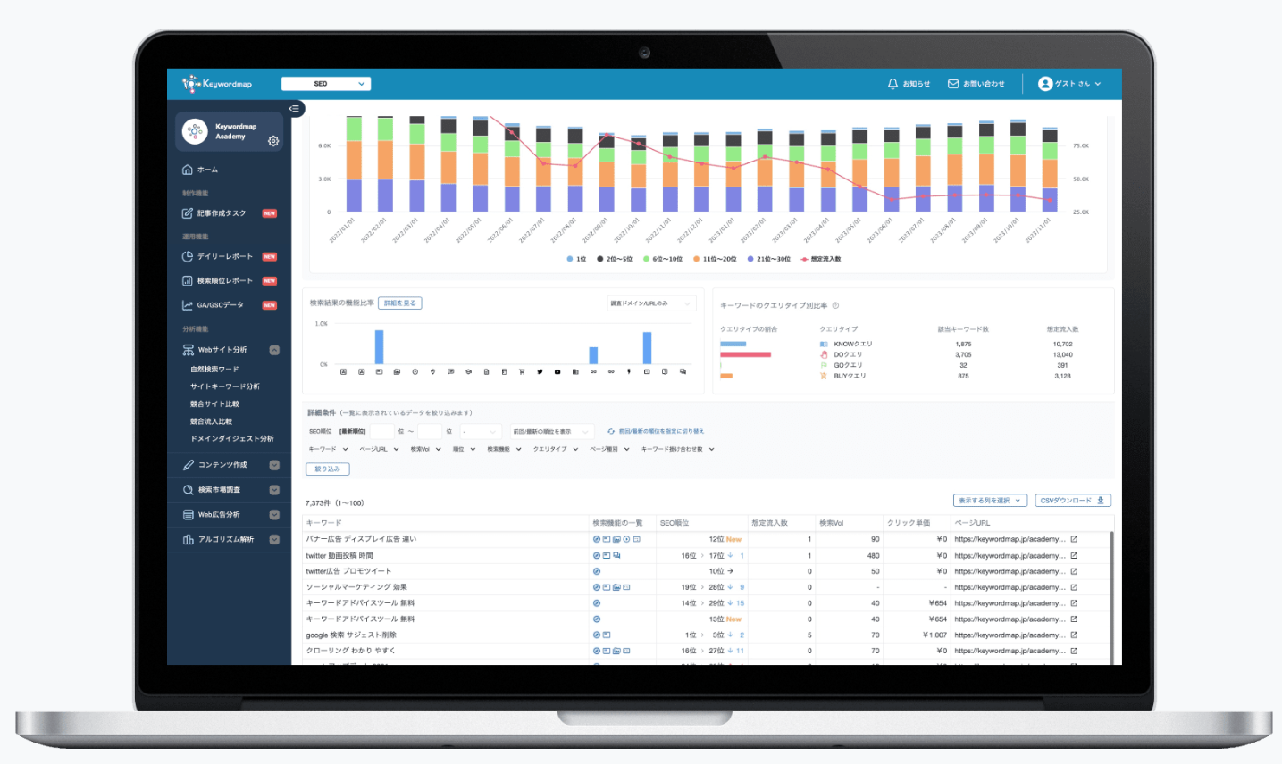 Keywordmapは、SEOやコンテンツマーケティング、SNS分析など多方面のデジタルマーケティングを支援するクラウド型の分析ツールです。検索キーワードのボリュームや競合分析、ユーザーインサイトをビッグデータから抽出し、可視化してレポーティングを行えます。これにより、ターゲットとなるユーザーのニーズや検索意図を正確に把握し、効果的な施策を素早く実行可能。また、SNS上での評判分析や競合動向のモニタリングなど、総合的なマーケティング戦略の策定をサポートします。