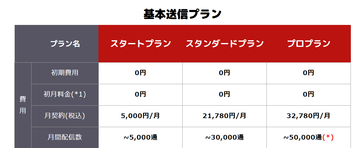 スタートプラン(5,000円/月)、スタンダードプラン(21,780円/月)、プロプラン(32,780円/月)