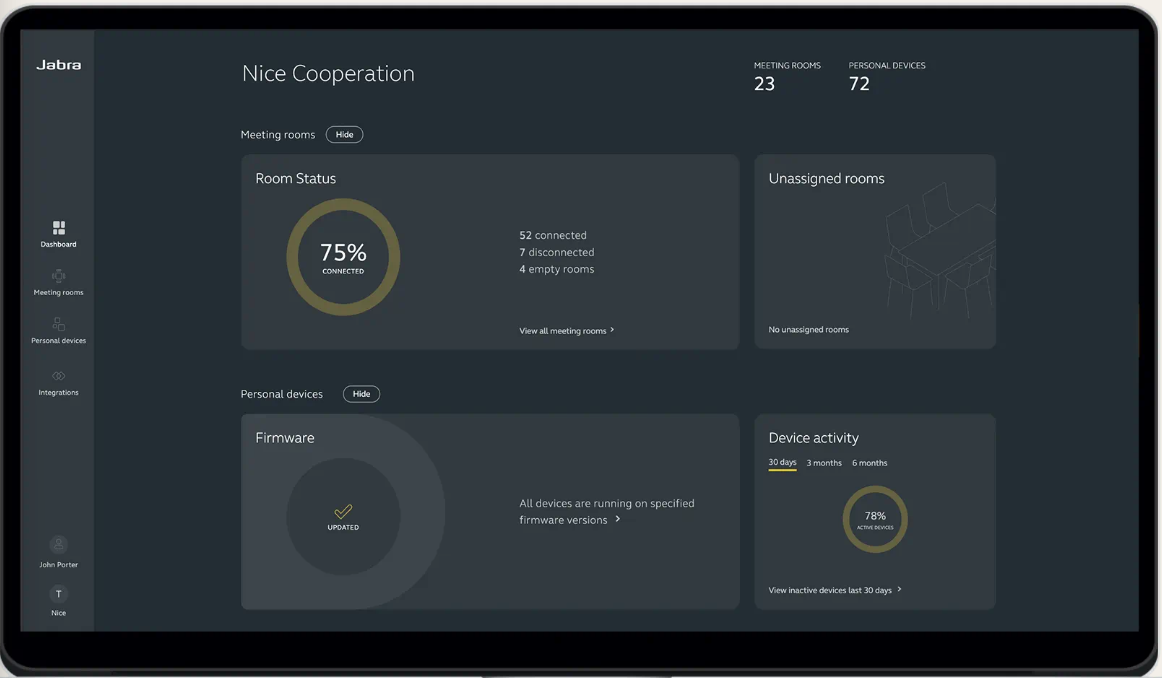 Jabra Plusは、Jabra製ヘッドセットやスピーカーフォンの設定やファームウェア更新などをクラウド上で一元管理できるソフトウェアサービスです。複数のデバイスを導入している企業やコールセンターでの運用を想定しており、管理者はWeb管理画面からデバイスの状態をリアルタイムで確認し、必要に応じてリモートでアップデートや設定変更を行えます。これにより、運用コストや手間を削減しつつ、常に最適な通話環境を維持できます。