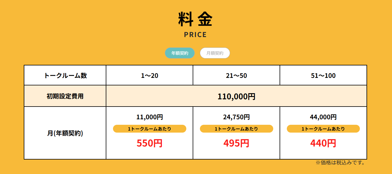初期費用110,000円(税込)/月額11,000円~(トークルーム数に応じた価格設定あり)