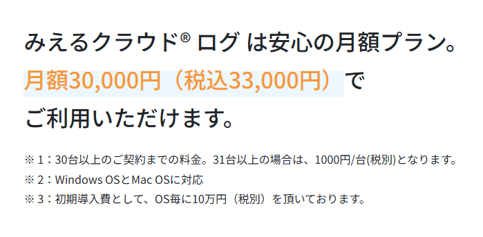 月額30,000円(税込33,000円)/30台まで(31台以上は1,000円/台 税別)/初期導入費:OSごとに10万円(税別)