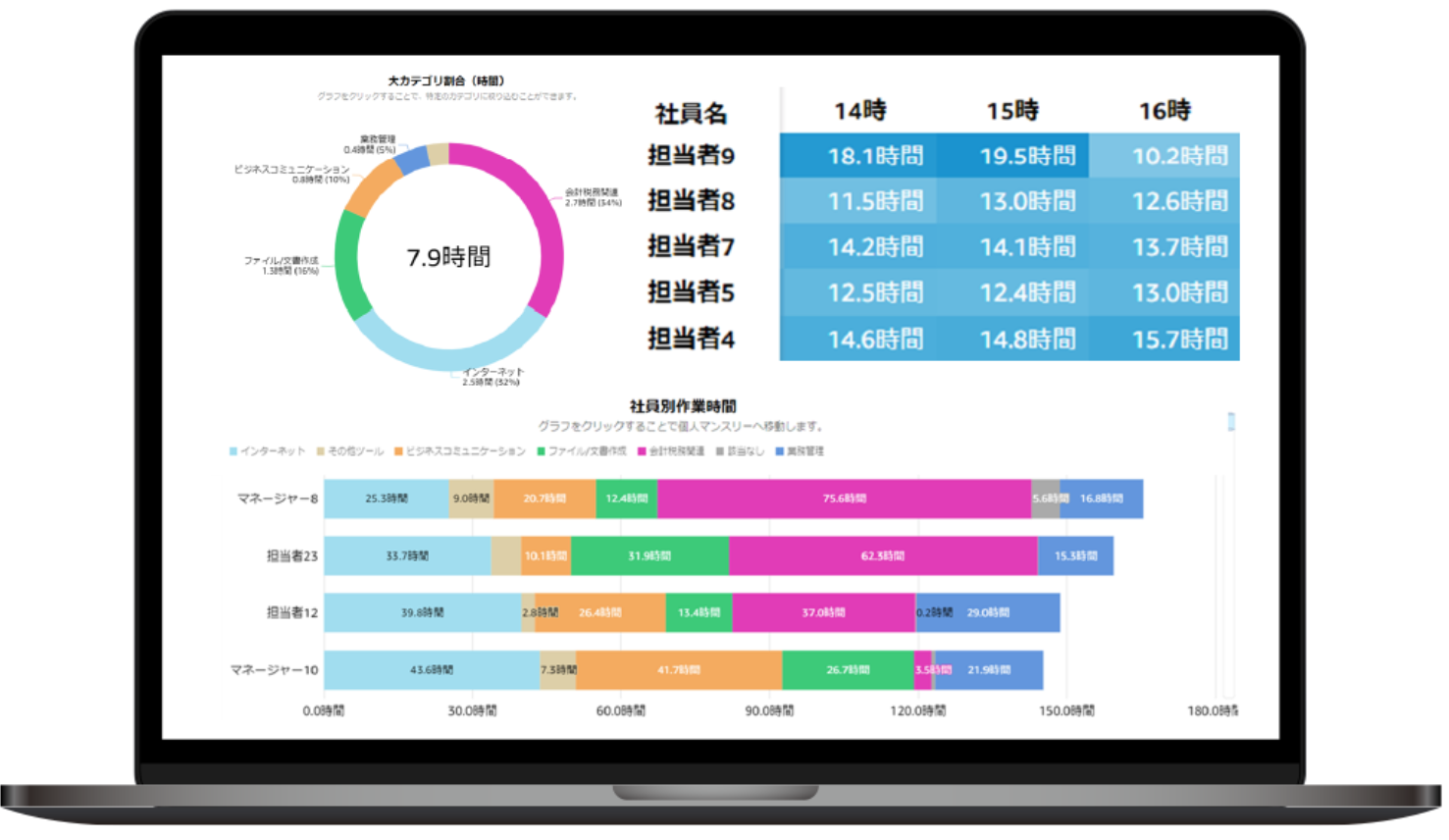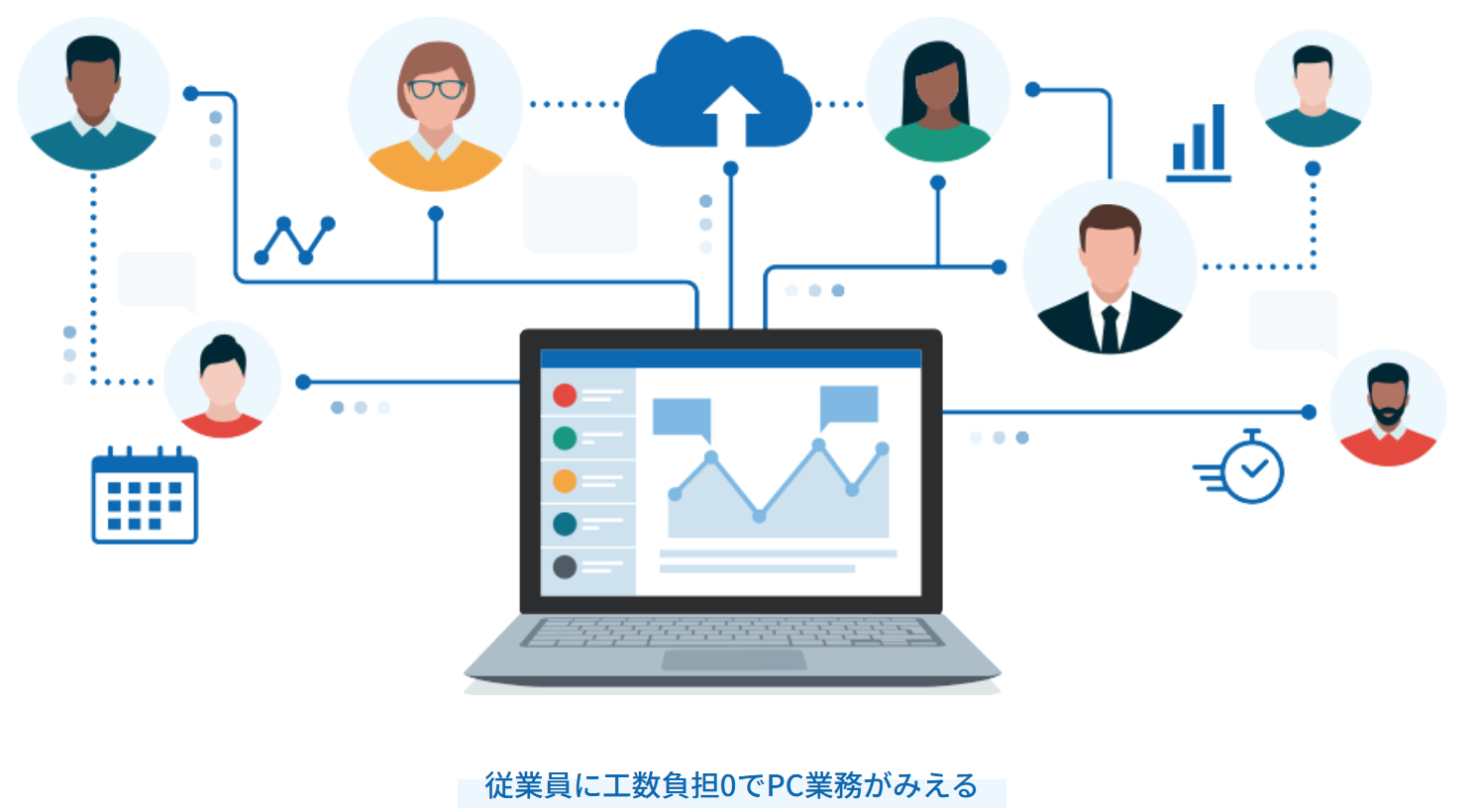 従業員に負担なくPC操作をログとして記録し、生産性向上と適切な人員配置をサポート。働き方改革やテレワーク環境の改善にも有効。
