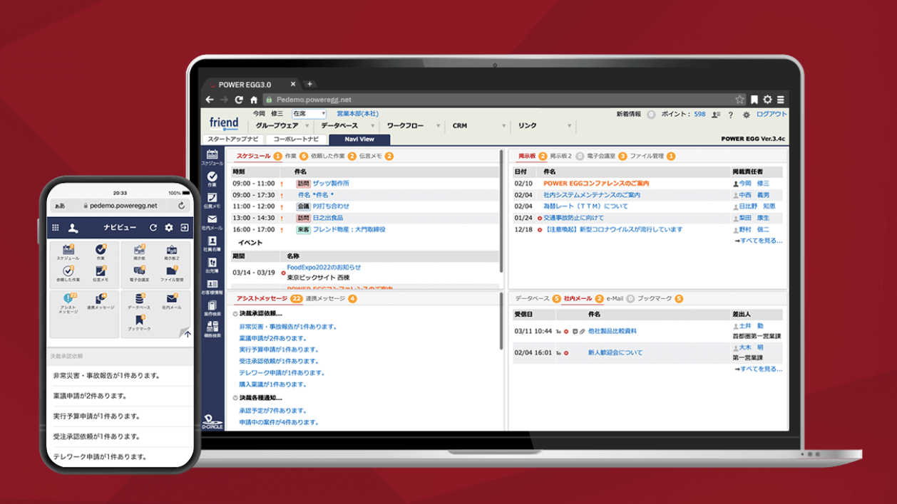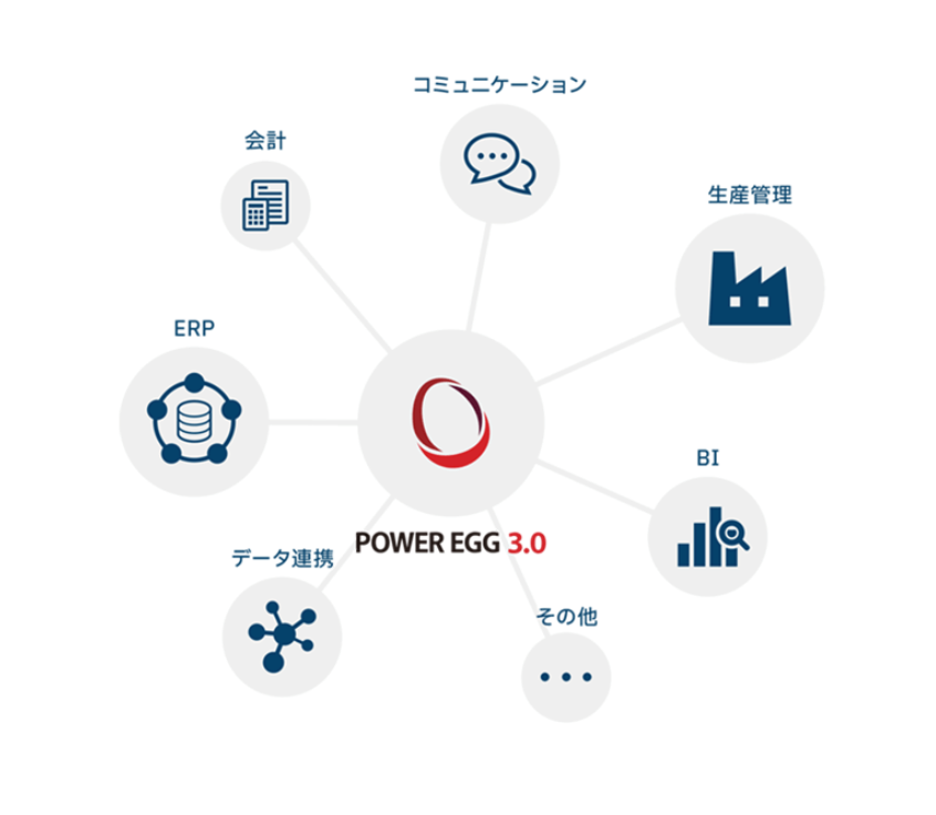 POWER EGG 3.0は、汎用申請ワークフロー、Webデータベース、グループウェア、CRMの4つの主要機能を統合し、業務のデジタル化と効率化を支援します。これにより、申請・承認業務のペーパーレス化、業務情報のリアルタイム共有、顧客情報の一元管理などが可能となり、組織全体の生産性向上に寄与します。 :contentReference[oaicite:2]{index=2}