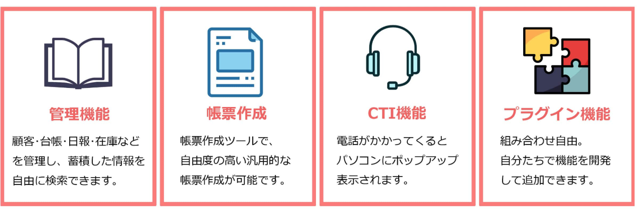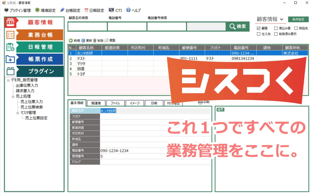 シスつくは、顧客管理、商品管理、見積・請求、台帳管理、日報管理、帳票作成、CTIの7つの基本機能を標準搭載しています。これにより、各種業務を一元管理し、情報の整合性を保ちながら業務効率を向上させます。