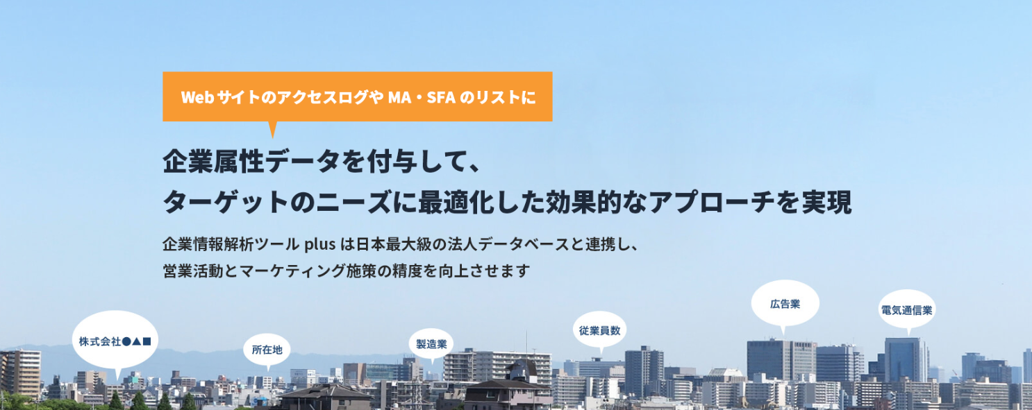 企業情報解析ツールplusは、株式会社パワー・インタラクティブが提供するサービスで、マーケティングオートメーション(MA)、SFA/CRM、Googleアナリティクス(GA)に対して、業種や従業員数などの企業属性情報を付与します。これにより、詳細なセグメント作成や効果検証が可能となり、マーケティング活用の幅が広がります。
