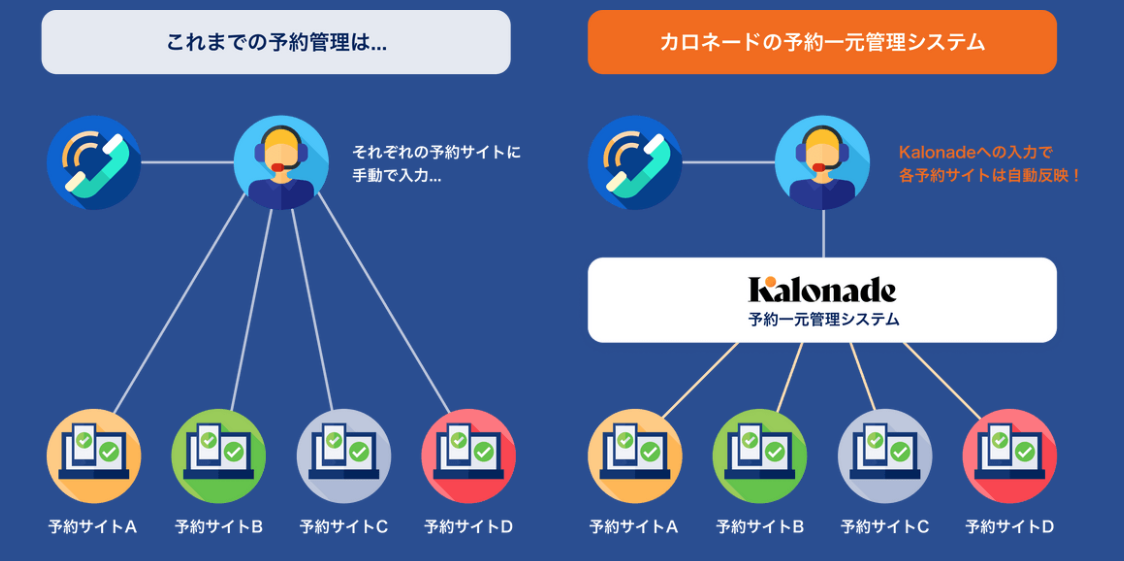カロネードの予約一元管理システムを使用すると、複数の予約サイトと連携されます。 施設情報やメニューの情報が統一されるだけでなく、空き状況もリアルタイムで更新されるため、煩雑な情報入力がなくなり、ダブルブッキングも避けることができます。