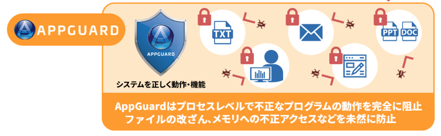 AppGuard Soloは、Windows PCを最新のサイバー脅威から守る製品です。未知のマルウェアやランサムウェアに対しても「不正な動作」を完全に遮断。アップデートが不要で、軽量なプロテクションエンジンを搭載しており、業務の支障になりません。