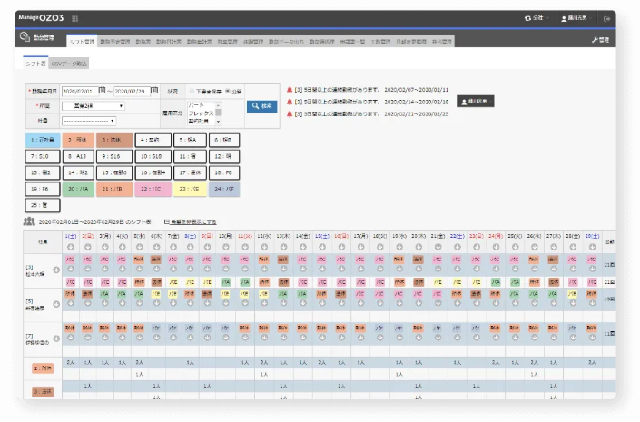 ManageOZO3の勤怠管理は、多様な働き方に対応した柔軟なシステムです。コールセンターやパート・アルバイト、時短勤務、フレックス、裁量労働制など、あらゆる職場と勤務体系にジャストフィットします。働き方改革関連法や36協定に即した通知機能もあり、安全な超過労働対策が可能です。