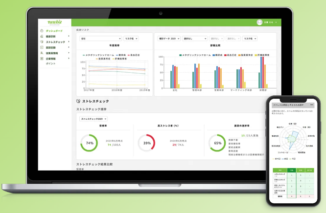 newbieはクラウド型の健康管理システムです。従業員の健康状態をリアルタイムで把握し、適切な対応を可能にします。健康診断の結果やストレスチェック、運動習慣など、多角的に健康を管理できます。