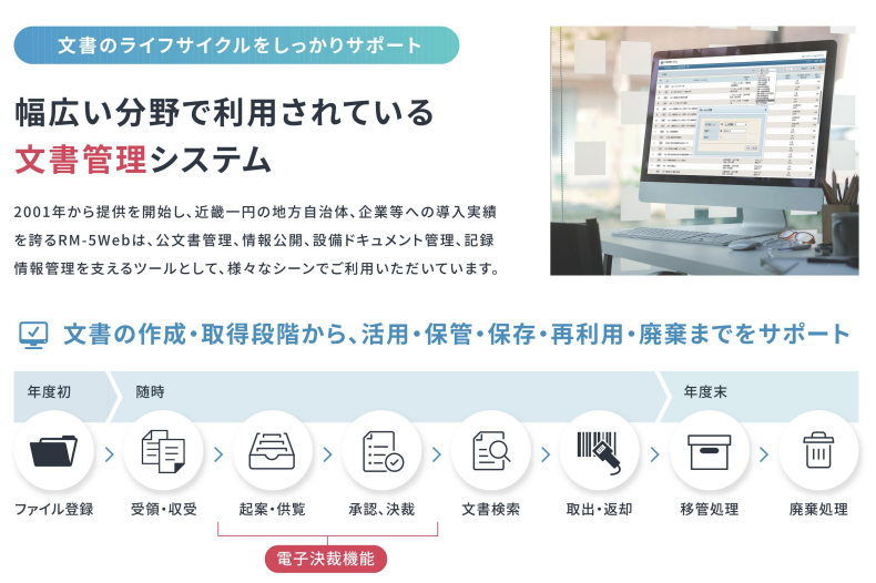 RM-5Webは、文書の活用から保管、保存、廃棄までのライフサイクルと原本のロケーション管理をイントラネット上でしっかりとサポートする統合文書管理システムです。Webブラウザの利用によりクライアントソフトが不要で、セキュリティ機能も組織単位又はユーザ単位での設定が可能です。