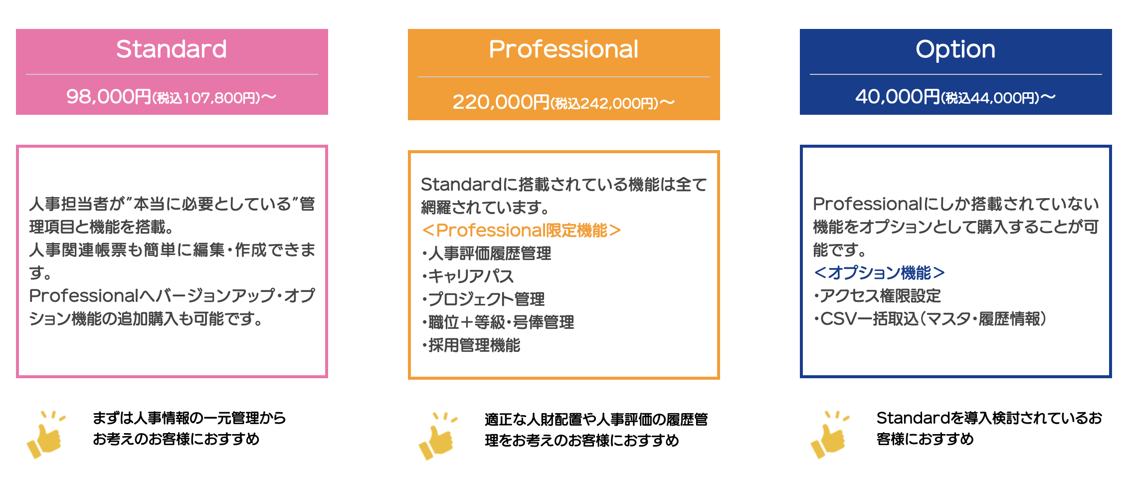 Standard:98,000円(税込107,800円)〜、Professional:220,000円(税込242,000円)〜、Option追加可能(各44,000円〜)