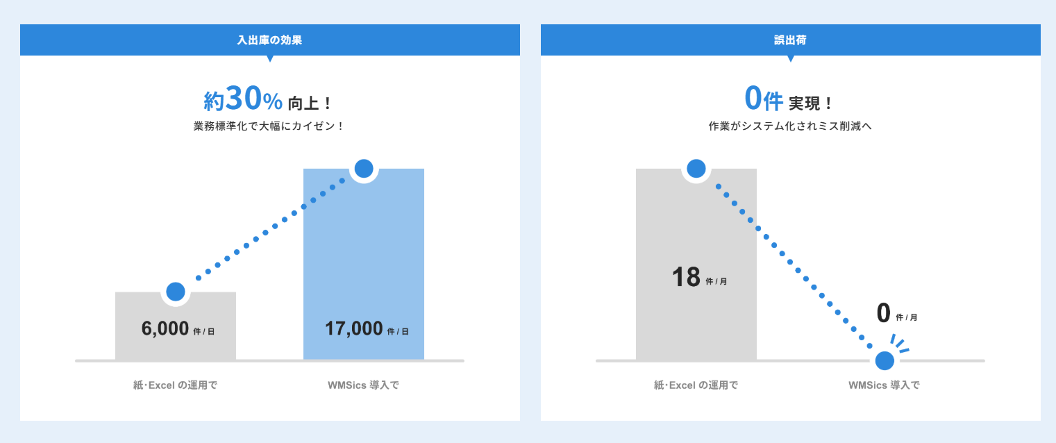 WMSicsは、バーコード&入出庫端末を活用した在庫管理により、転記ミスや人的エラーを大幅に削減。特に誤出荷に対しては照合機能とナビゲーションが威力を発揮し、出荷時のチェックを標準化。これにより、社内・社外からのクレームを防止でき、品質と信頼性が向上する。