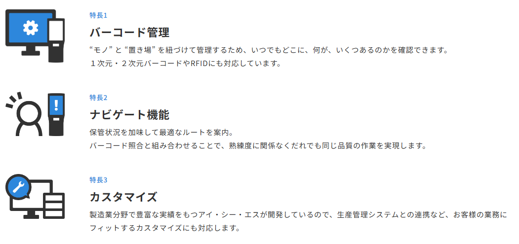 中堅製造業や物流業向けの在庫管理システム。パッケージ型でありながら自社開発により柔軟なカスタマイズが可能。バーコード管理とナビゲーション機能を活用し、リアルタイムで在庫状況を把握し、誤出荷・入出庫ミスを削減。属人化解消や棚卸負担の軽減にも寄与。運用開始から3ヶ月でミス削減、6ヶ月で業務効率化、15ヶ月で機能拡張や連携へと進化する3段階の活用ステップを提案している。
