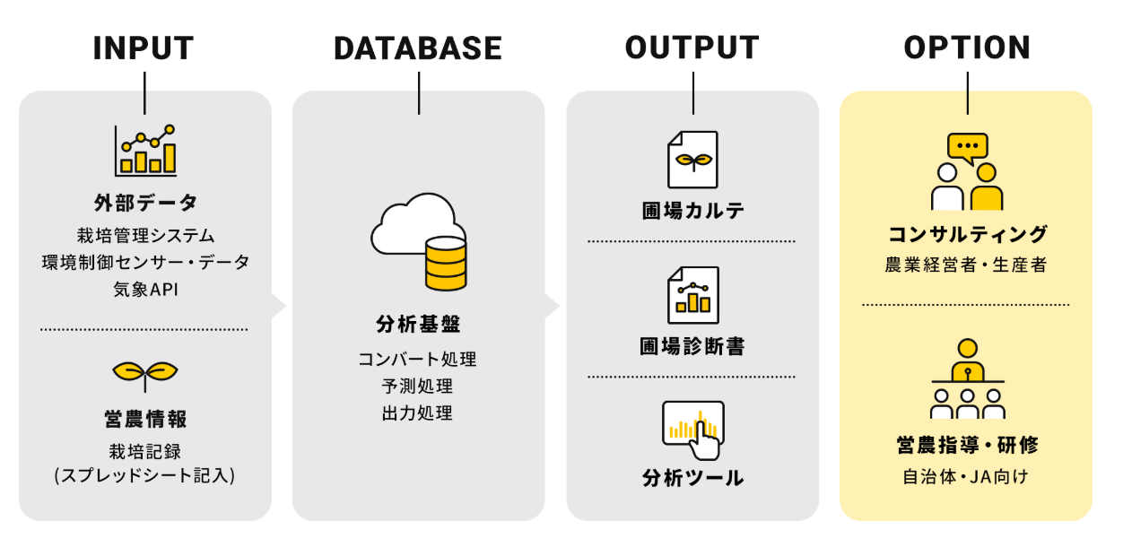クラウド型農業経営支援サービスで、営農データや環境データなど複数の情報を一元管理し、クラウド上で可視化・分析を行う。JAや自治体の指導員も同時にアクセスでき、指導マニュアルの作成・データ分析・営農指導の標準化が可能。PCやタブレットからのアクセスを想定した設計で、現場の業務に合わせた柔軟な活用ができる。