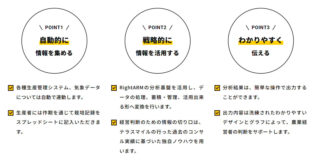 RightARMは、農業経営における営農データを一元管理し、可視化・分析することで「説得力のある指導」を可能にするクラウドサービスです。指導者と生産者の間のコミュニケーションを円滑にし、経験則に頼らない科学的アプローチを支援します。施設園芸や露地野菜に関する5項目の入力をもとに、気象データや市場データ、労働データなどを統合し、生産指導のPDCAをデータで回せる環境を構築します。