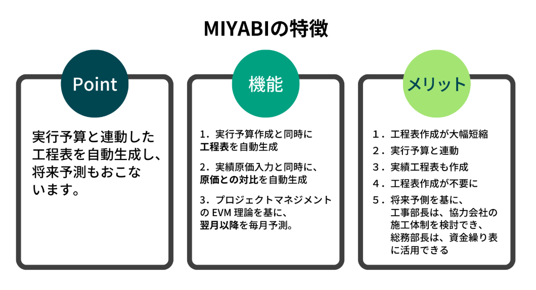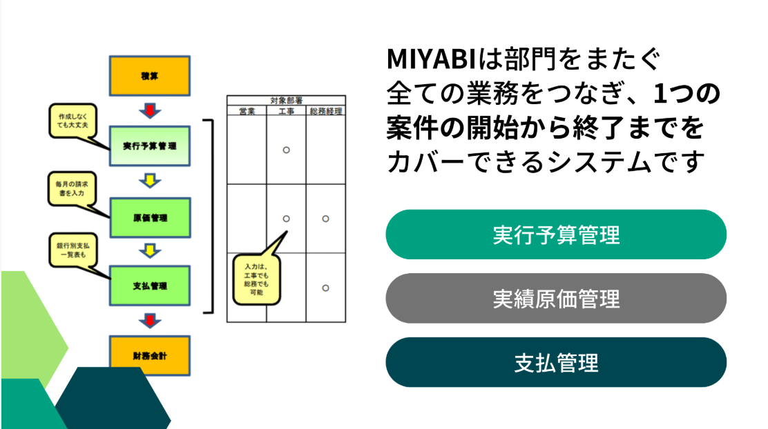『MIYABI』は、建設業に特化した現場効率化支援クラウドシステムで、実行予算・原価・支払・月次報告などの業務を一元化します。Excelの使いやすさを維持しつつ、データの信頼性や集計の正確性を担保できるよう、データベース連携機能を実装。現場代理人・工事部長・経営者・総務経理など、部門横断的に利用可能で、入力から出力までの業務プロセスを効率化します。帳票出力も豊富で、御社独自の仕様に柔軟に対応。