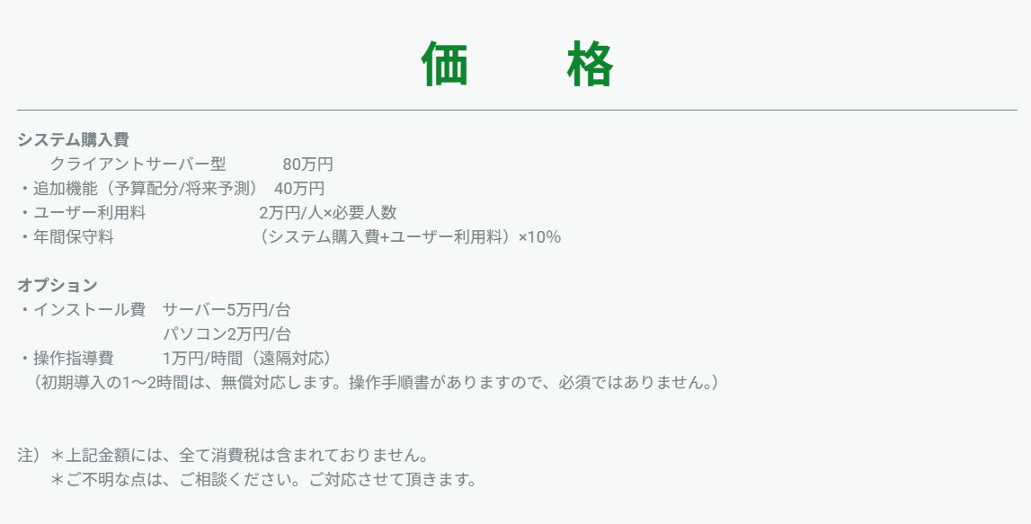Windows PC対応。インターネット接続でクラウド運用。Excel互換の操作性を重視。