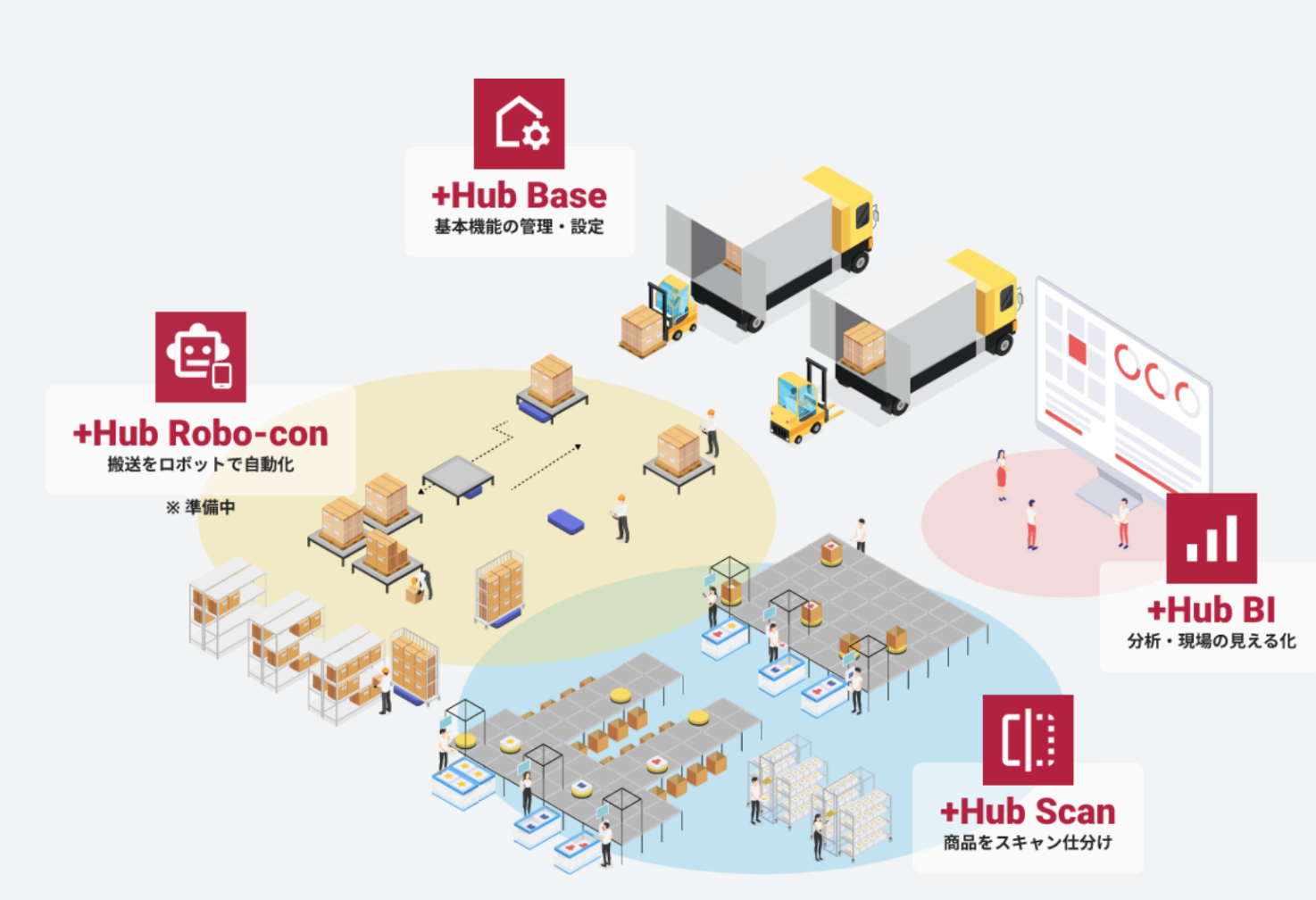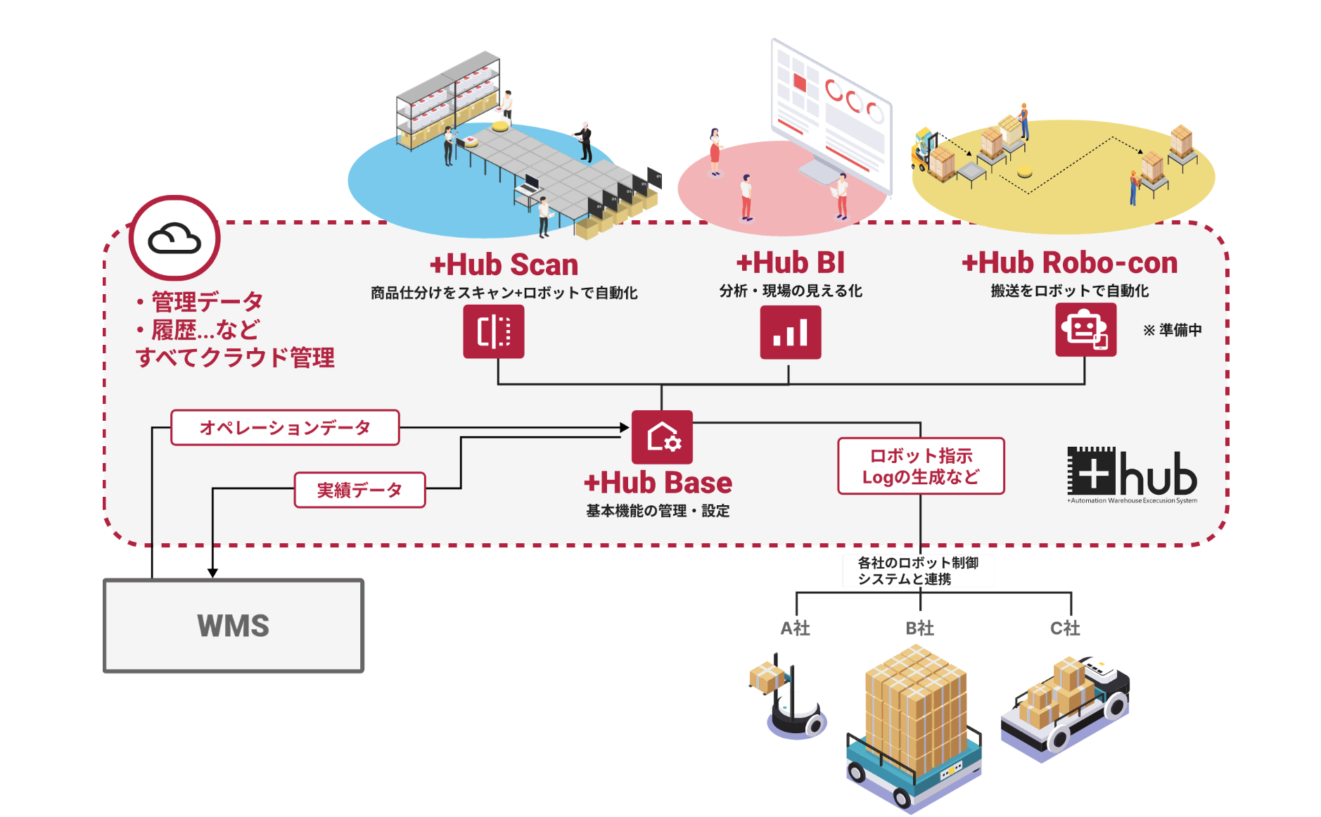 +Hubは、物流倉庫内での仕分け・搬送・検品などのオペレーションを、ロボットとシームレスに連携して自動化するためのシステムです。従来複雑だった連携や制御を、パッケージ化された仕組みによって簡単に実現。導入先の作業現場に合わせたアプリケーションとの組み合わせにより、無理なく段階的に自動化を進めることが可能です。
