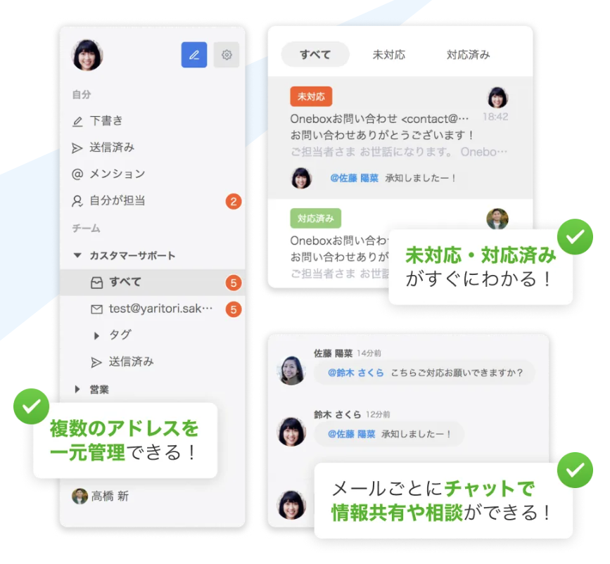 メールごとに「未対応」「対応済み」などのステータスや返信担当者の設定ができ、二重対応や対応漏れを防ぎます。
