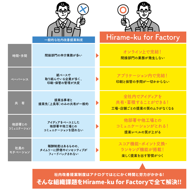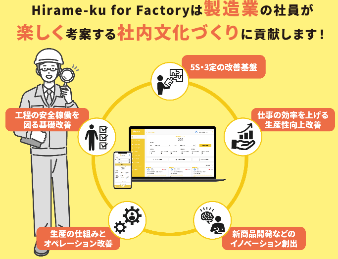 Hirame-ku for Factoryは、製造業における現場改善や商品提案を活性化するためのクラウドサービスです。従業員がアイディアを匿名または実名で簡単に投稿でき、管理者は評価・フィードバックを自動で行えます。これにより、従来の紙ベースの煩雑な運用から脱却し、全社で楽しく継続的にアイディアが生まれる文化づくりを支援します。