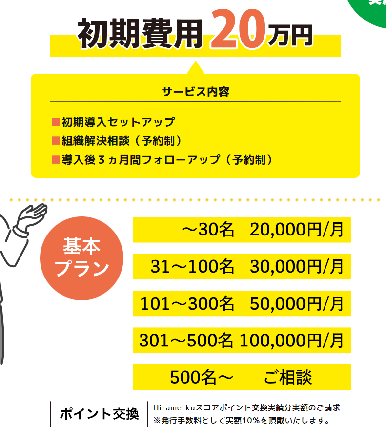 トライアル30日間無料。正式導入時はスコアポイント交換実績に基づいた従量課金(10%手数料)+初期導入サポート含む。