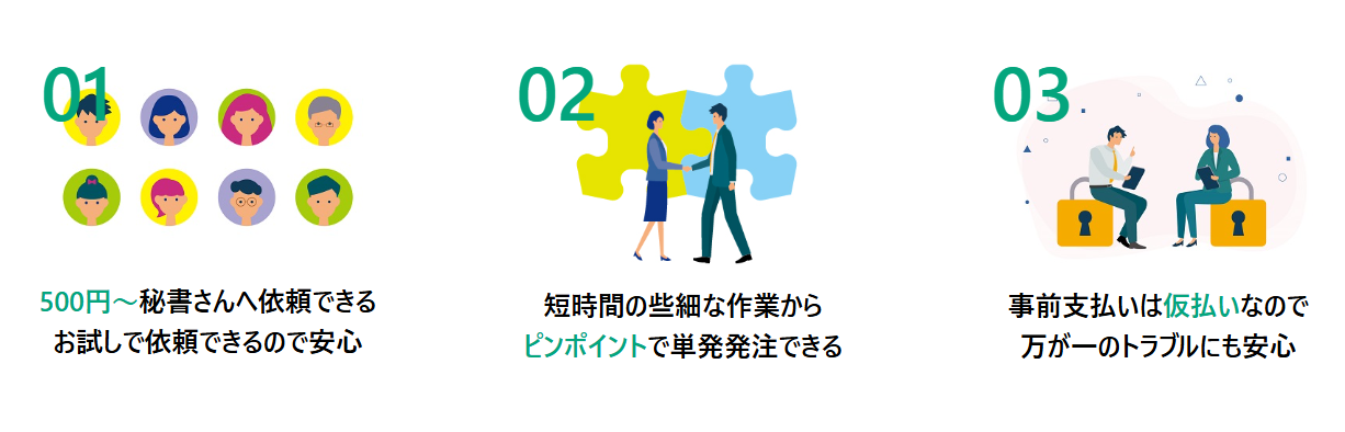 HISHOSUPPLでは、資料作成・スケジュール調整・経理・記帳・SNS更新・ブログ執筆・画像作成・HP更新など幅広い業務を、業務経験豊富な秘書が代行。業務の相談から契約まで専用チャットルームで進行でき、業務完了後に支払い確定される仮払い制度も導入。短時間・単発業務でも依頼可能で、必要な時にピンポイントで人材を活用できるのが大きな特長です。