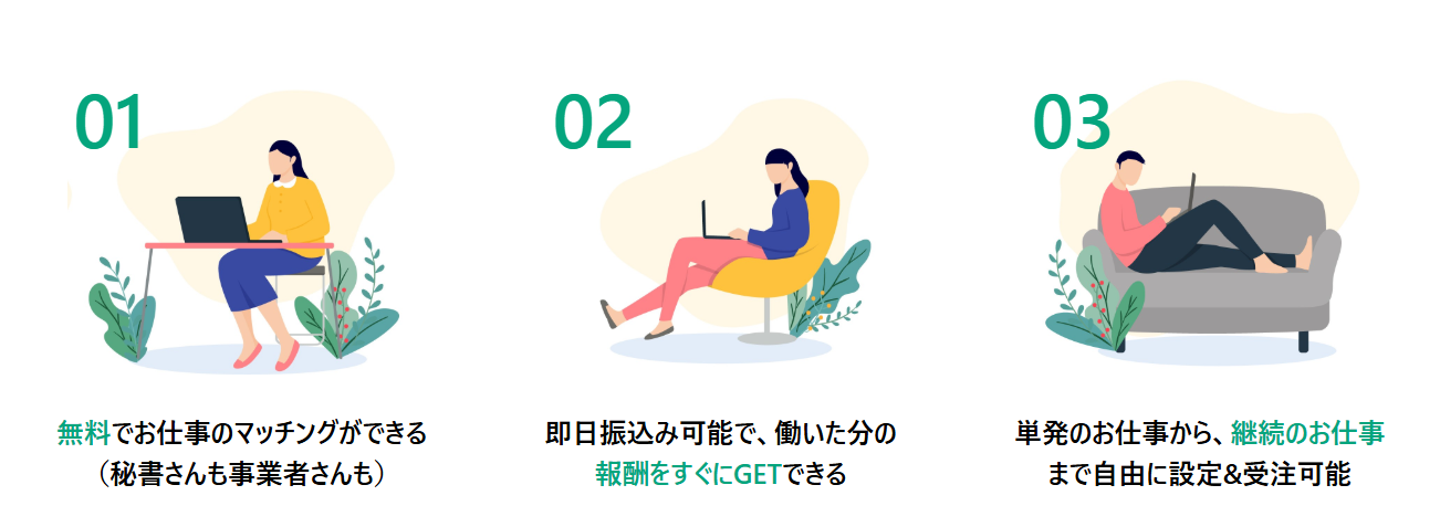 利用者は業務内容・時間に応じて3つのプラン(月10時間/20時間/36時間)から選択可能で、いずれも土日祝対応・業務自由設定・秘書指名可能。初回限定プランでは特別料金でのお試しも可能。一方、秘書側も単発・継続を自由に設定でき、働いた分の即日報酬受取が可能。利用者・秘書双方にとって柔軟で安心できるマッチング環境を提供します。