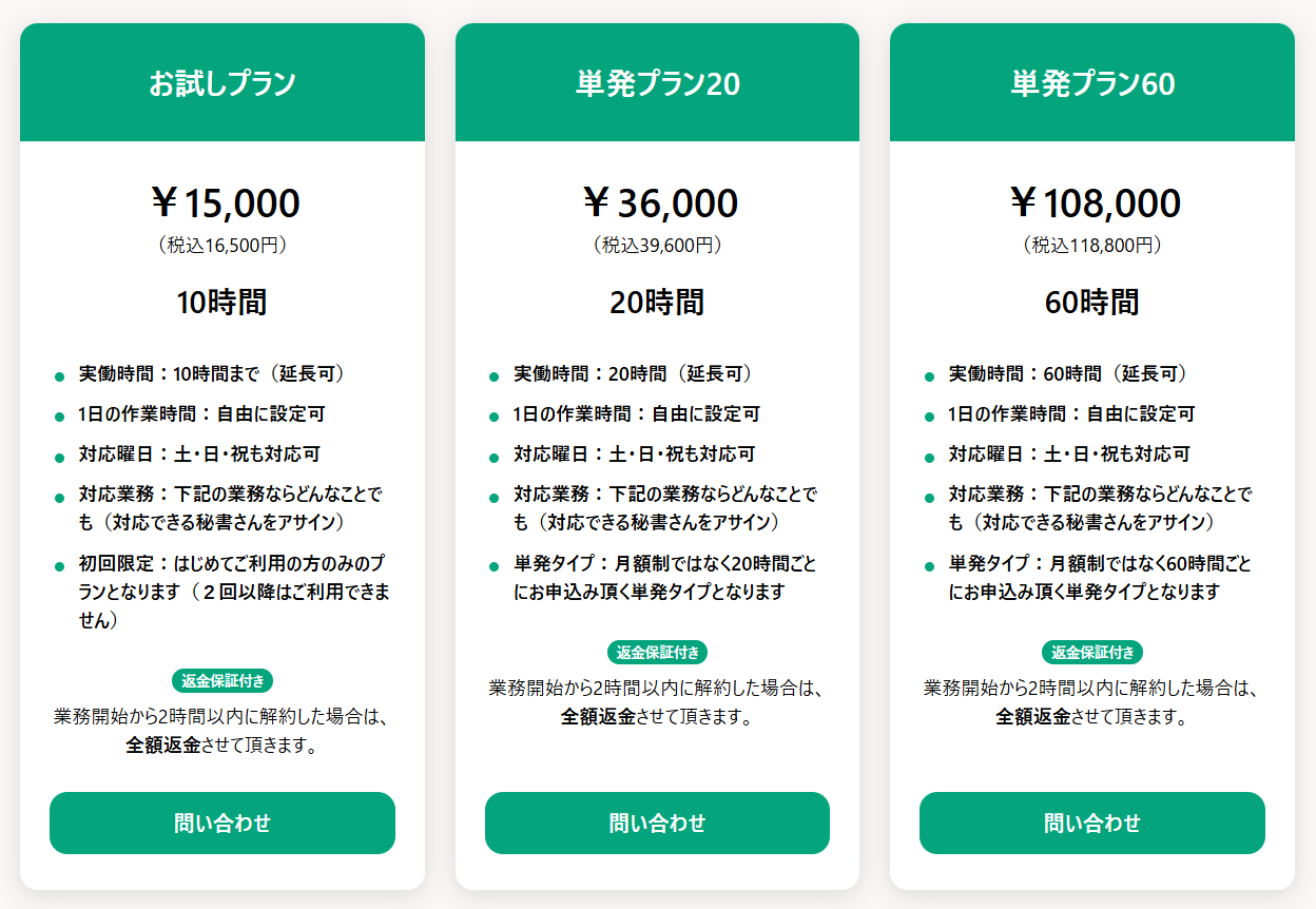 月10時間:15,000円/月20時間:30,000円/月36時間:50,000円(いずれも税込・単発型対応あり/初期費用・登録無料)