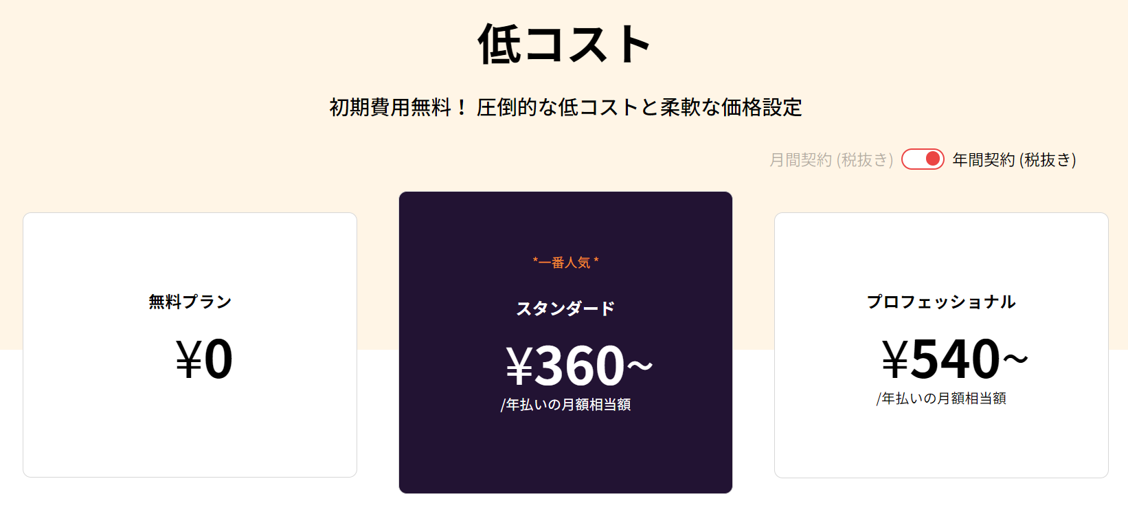 無料プランあり、その他プランは月間・年間契約で価格が異なる