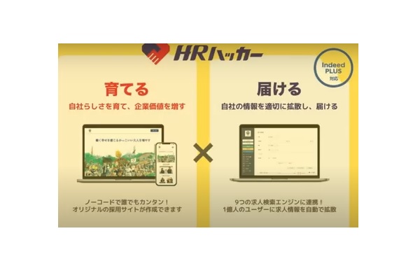 HRハッカーは、ノーコードでオリジナル採用サイトを簡単に作成でき、さらに求人情報を最大8つの求人検索エンジンへ一括自動拡散できる、採用広報クラウドサービスです。最大30ページまでコンテンツを構築でき、企業理念やスタッフの声なども柔軟に掲載可能。WebやSNSを活用した採用に不慣れな地域企業でも使いやすく、採用ブランディングと情報発信力を育てながら、応募者数の増加とミスマッチの削減を実現します。専任の伴走サポート付き。