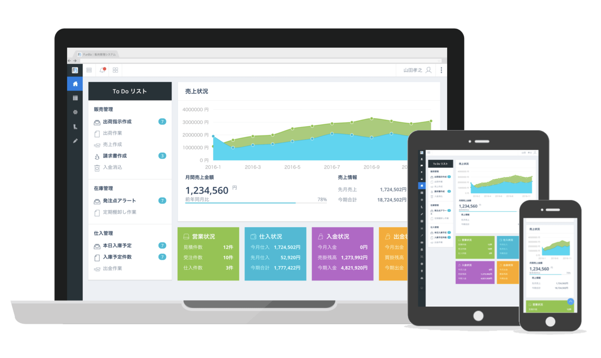クラウド型の販売管理システム。見積作成、受発注、請求、在庫管理、仕入れまでを一気通貫で管理でき、ダッシュボードでリアルタイムに可視化。レスポンシブ対応でPC・スマホから操作可能。導入サポートや社員レクチャーも無料提供。