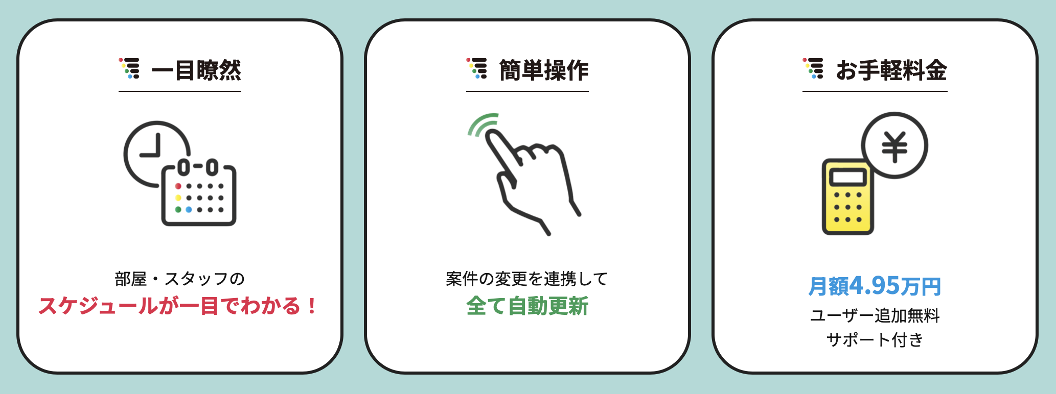 スタッフや設備、場所ごとの事前登録とドラッグ操作で、案件登録や修正が直感的に完了。共有機能や通知機能により、伝達漏れやダブルブッキングのリスクを最小化。無料トライアル後も安心して導入できるサポート体制が整っている。