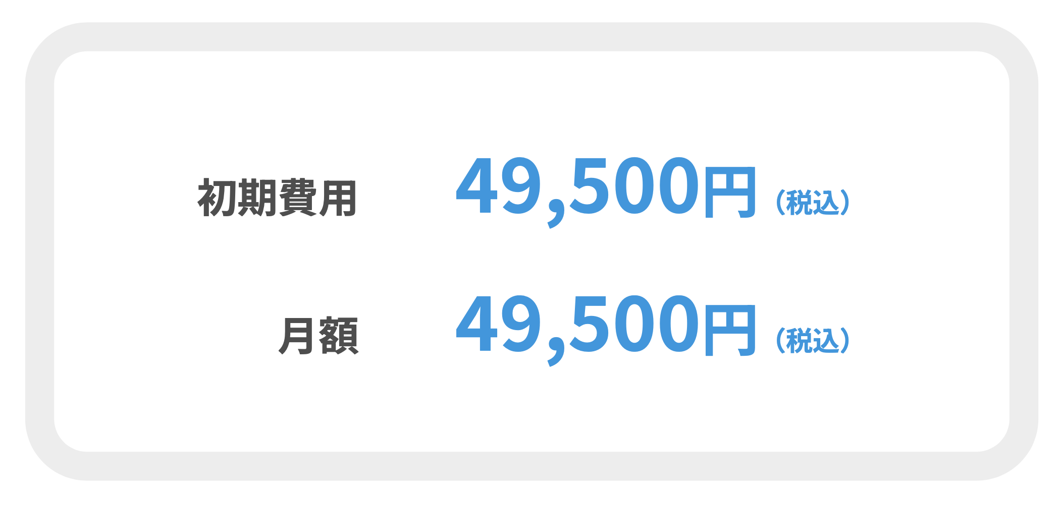 初期費用:49,500円(税込)、月額:49,500円(税込)、ユーザー追加無料、サポート付き、1ヶ月無料トライアルあり