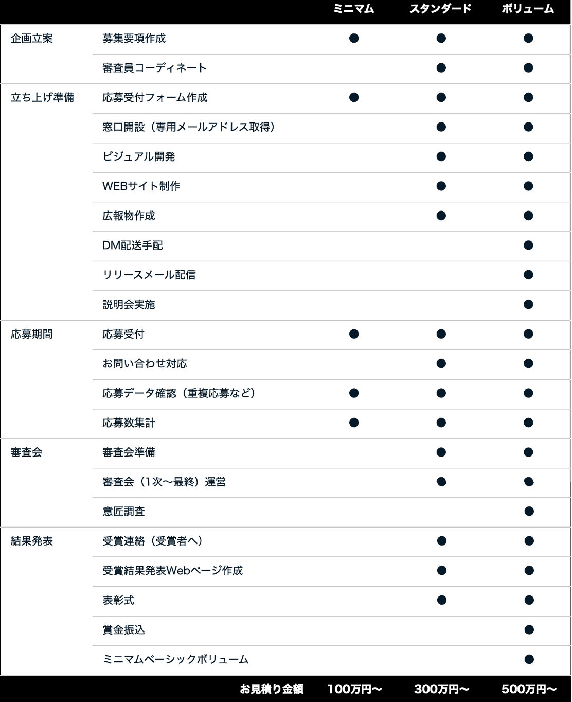 運営支援の内容に応じた個別見積制。ミニマム/スタンダード/ボリュームの3プラン例あり。内部体制に応じて必要部分だけの委託も可能。